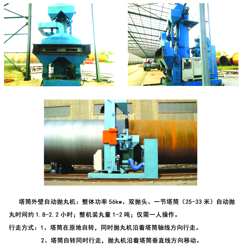整體功率56KW、雙拋頭、一節塔筒(25-33米)自動拋丸時間約1.8-2.2小時;整機裝丸量1-2噸;僅需一人操作。