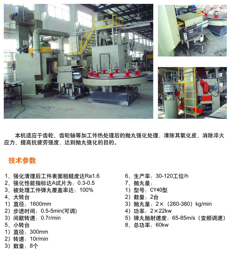 本機適應于齒輪、齒輪軸等加工件熱處理后的拋丸強化處理,清除其氧化皮,消除淬火應力,提高抗疲勞強度,打到拋丸強化的目的。