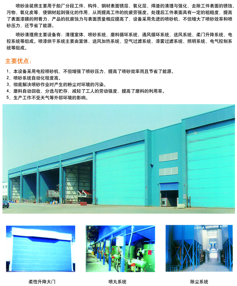 噴砂涂裝房主要用于船廠分段工件、構建、鋼材表面銹層、氧化層、焊渣的清理與強化,去除工件表面的銹蝕、污氧化皮等,使鋼材起到強化的作用,從而提高工件的抗疲勞強度。